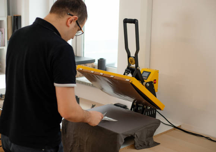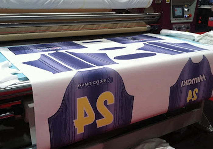 The printed transfer sheets are then heat-pressed onto specially coated polyester fabrics using our large-format heat transfer machines.